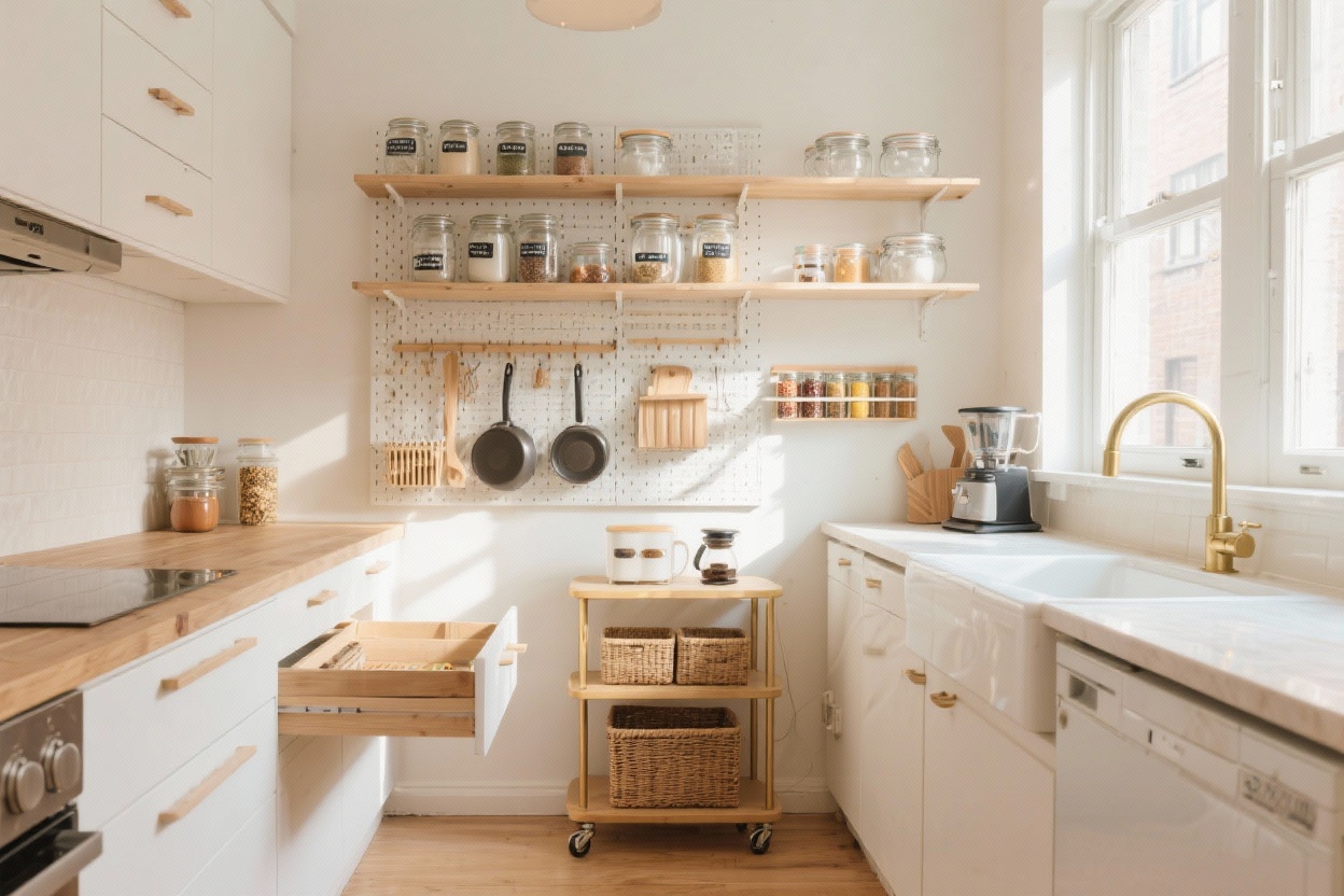 Use wood drawer dividers for a custom look, and display spices in a tiered bamboo rack so labels face forward. A tall corner becomes a coffee altar with a rattan tray, mug hooks, and airtight canisters. Cozy, collected, but always organized.