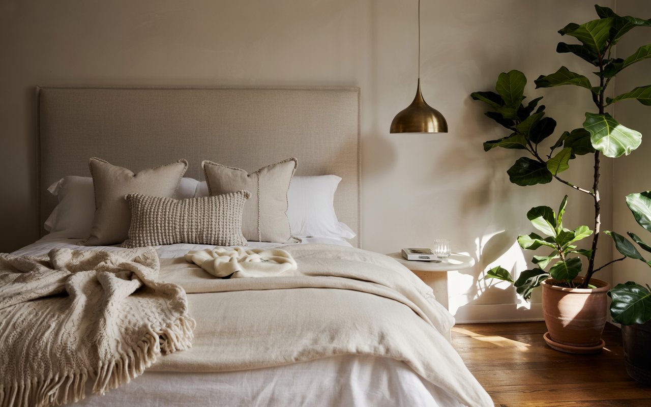 Layering textiles is a simple way to bring warmth and style to your bedroom. In the image, you can see a beautifully made bed with a mix of textures and colors. The soft, neutral bedding creates a calming base, while the addition of a chunky, woven throw adds depth and interest.