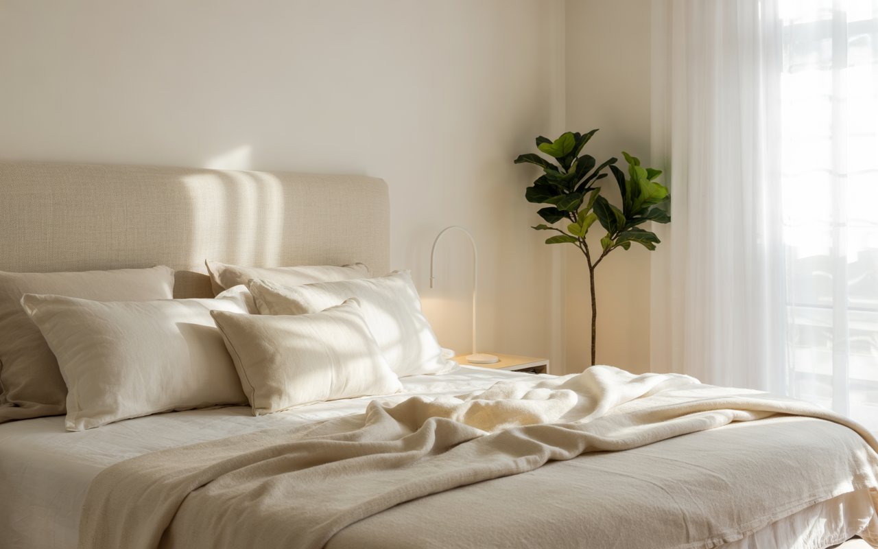The image showcases a beautifully styled bedroom with soft beige walls and bedding. The natural light streaming in enhances the soothing vibe, making it a perfect retreat. The use of various textures, like the linen bedding and woven rug, adds depth and interest to the space.