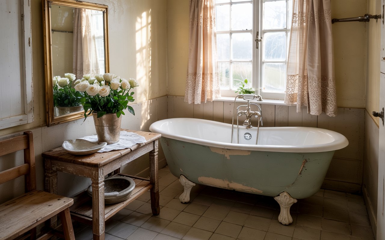 Natural light streams in through the window, highlighting the delicate lace curtains. This soft touch adds a homey feel, making the bathroom a welcoming retreat. A small table with a floral arrangement brings life to the corner, enhancing the cottage vibe.